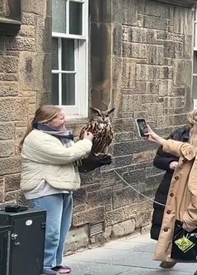 The scene shows a woman in a white jacket and blue jeans holding a large Eurasian eagle-owl on a gloved hand. The owl is perched calmly and looking towards the right. Another woman is taking a photo of the scene with her phone. A third woman is standing to the right, near the person taking the photo, wearing a tan trench coat and holding a green shopping bag. A black speaker is visible to the left of the woman holding the owl. The background consists of a stone building with a white-framed window. The scene appears to be taking place on a city street or sidewalk. The people seem to be engaging in a tourist activity or event.