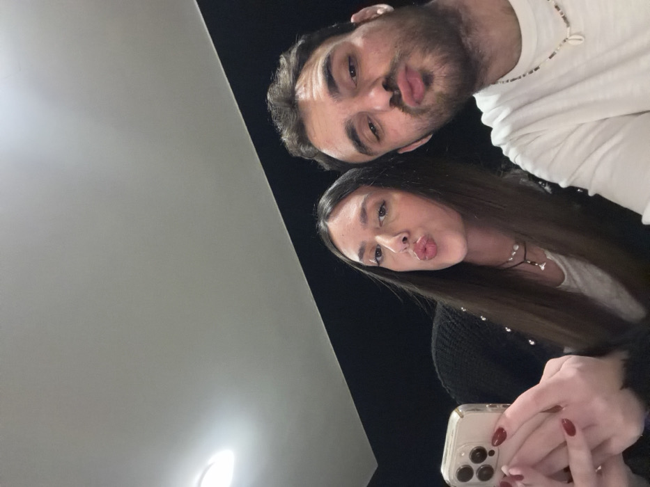 A couple poses for a selfie, both puckering their lips for a kissy face. The woman, with long brown hair, holds the phone, her hands displaying manicured nails. She wears a black cardigan and a beaded necklace. The man, positioned above her, has a short beard and is dressed in a white t-shirt with a beaded necklace. The background is dark, with a bright light source visible to the left.