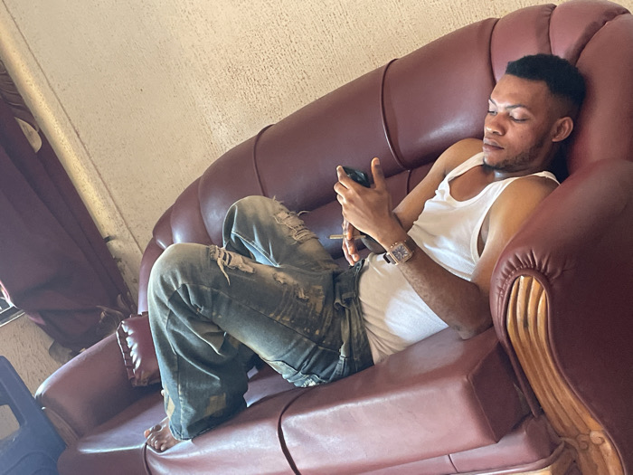 In an interior setting in Ogbunu, Nigeria, a single male subject is observed reclining on a reddish-brown, multi-seater upholstered sofa