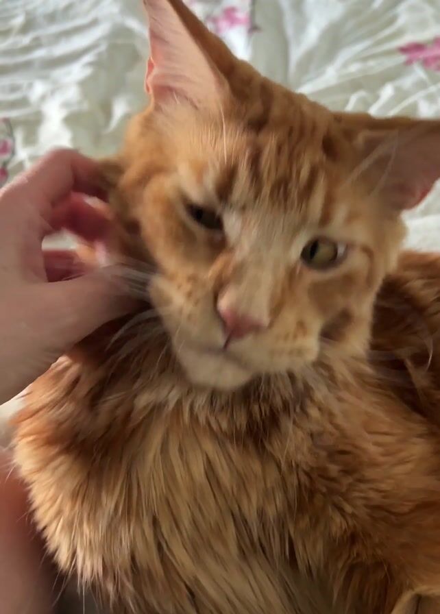 A close-up shot shows a person’s hand with red nail polish gently caressing the chest of a large, ginger-colored Maine Coon cat that's lying down on a bed with a floral patterned sheet. The cat’s eyes are semi-closed and it appears relaxed, though it has a slightly grumpy expression. The hand is moving gently on the cat's fur. The light is bright and clear, illuminating the details of the cat's fur and whiskers.