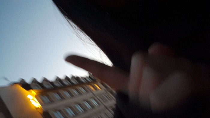 The image presents a blurry, low-angle perspective looking upwards. In the foreground, a light-skinned human hand occupies the lower right quadrant, making a "V" gesture with extended index and middle fingers. The hand exhibits significant motion blur. In the left background, a multi-story, modern building with a distinct stepped facade and numerous rectangular windows is visible. The upper section of this building features an illuminated yellow sign with indistinct lettering against a dark panel, consistent with commercial branding. The upper right portion of the frame shows a clear, light blue sky. A dark, indistinct mass, consistent with human hair, is visible along the far right edge. The architectural features of the background building, particularly its design and illuminated sign, identify the location as the **Hilton Strasbourg hotel, Avenue Herrenschmidt, Strasbourg, France**.