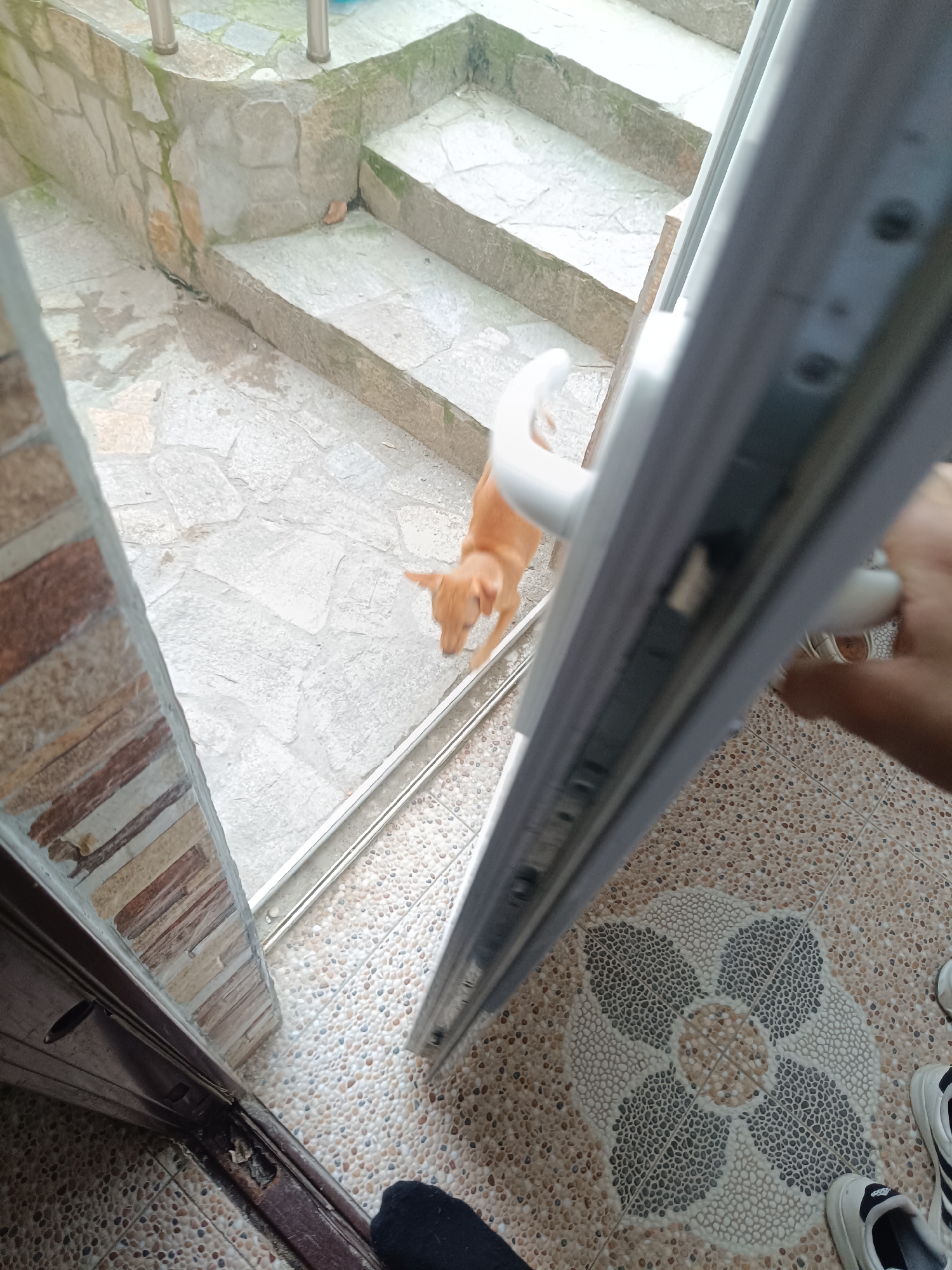 The scene depicts an exterior area observed through an open, white-framed doorway, from an interior perspective in the city of Unknown, Unknown. A light-skinned right human hand grips a white door handle, while two feet, wearing white sneakers with black accents and a black sock on the left foot, are visible on the interior floor. This floor features a light brown and beige pebble-dash mosaic with a central floral design composed of lighter and darker pebbles. Outside the doorway, a lean, short-haired, light orange-brown dog stands on irregular light-colored stone paving, oriented towards the left with its head lowered. Beyond the paved area, a set of roughly hewn stone steps and a stone retaining wall, both partially covered in green moss or algae, ascend towards the left of the frame. Two silver-colored metal railings are affixed to the top of the stone wall/steps. The bottom track of the open sliding door is visible, alongside a dark brown interior door frame structure on the left.