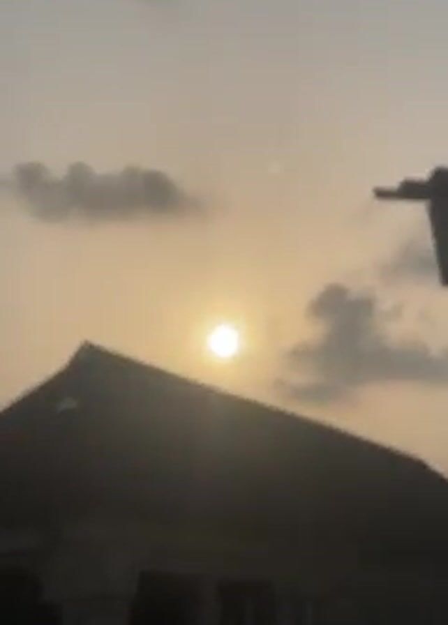 low-angle shot of the sun, partially obscured by clouds, setting or rising behind a house