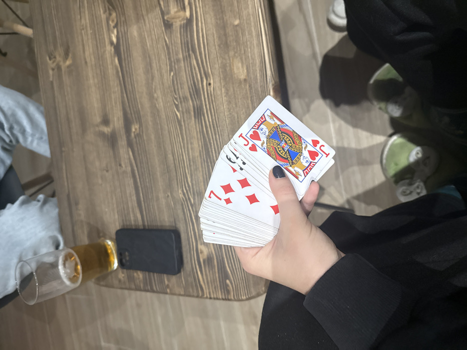 A person holds a deck of playing cards, the top card is the Jack of Hearts, over a wooden table. On the table are a black cell phone and a tilted glass of beer. The person is wearing a black jacket. In the background, another person is partially visible, wearing grey pants. The floor is visible with multiple pairs of shoes.