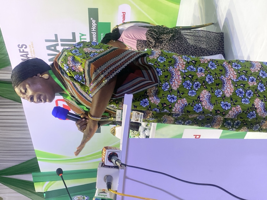 A dark-skinned woman, likely middle-aged, stands in profile, facing right, speaking emphatically into a blue-and-black wired microphone held in her right hand. Her mouth is open, and her left hand is raised with the palm slightly open. She wears a dark head covering, gold-toned teardrop earrings, and gold-toned bangles on her left wrist. Her attire consists of a long, flowing dress with an olive-green base adorned with blue and pink floral patterns and green leaves. The sleeves feature a distinct striped pattern in brown and grey tones, embellished with small, light-colored studs. To her left, a white podium holds an array of press microphones, including those marked "AIT" and "Newsg," with their cables extending downwards. Behind the microphones, several gold-colored, trophy-like objects are visible on the podium. The background features a large white and green event banner. Partially visible text on the banner includes "NAFS," "AFRICAN FEDERATION OF AGRICULTURE, RURAL," "NATIONAL SOIL," "Renewed Hope," and the "USAID" logo with the phrase "From the American people." Dark green fabric drapes are visible in the upper left background, suggesting an indoor event setting. A second individual, partially obscured, is visible behind and to the right of the main speaker, wearing a light pink top and a dark, patterned lower garment, possibly a skirt or dress. The floor appears to be a smooth, light-colored surface. The scene is located in a conference or event hall in Unguwar Sarki, Nigeria.
