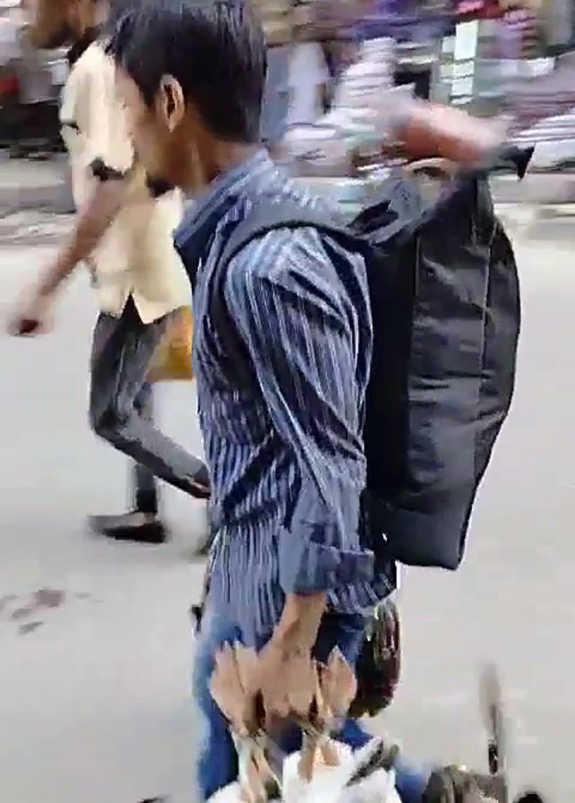 A man in a blue-striped shirt and blue jeans is walking down a street carrying several live geese. The geese are held upside down by their legs, and their wings are flapping. The man has a black backpack on his back. Another man in a tan shirt and black pants is walking in front of him. The street is lined with buildings and market stalls, and other people are walking around.