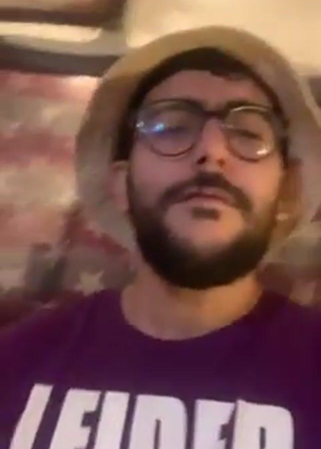 The video features a man wearing a purple t-shirt with white lettering, a light-colored hat, and round glasses