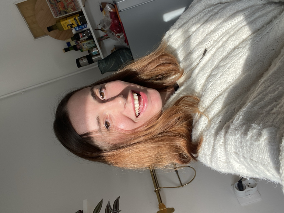 A young adult female with light skin and shoulder-length, reddish-brown hair is captured in a medium close-up, smiling widely with an open mouth, revealing teeth, and looking directly towards the viewer. She wears a cream-colored, textured knit zippered sweater with a visible silver-toned zipper pull. Bright, natural light illuminates her face and hair from the left, casting a strong shadow across the right side of her face and body. The background depicts an indoor domestic setting. To the viewer's left, a white wall displays a partial view of green plant foliage, a brass-colored wall-mounted rail system, and a white European Type E electrical outlet with a white plug partially inserted. To the right, a white shelf above a metallic appliance (likely a refrigerator) holds various kitchen items: several bottles (including what appears to be olive oil), jars, a metallic travel mug, a dark green ceramic pitcher, two circular wooden cutting boards leaning against the wall, and a framed graphic item. A clear plastic bag containing red, spherical items is visible near the appliance. The specific city of Lille, France, cannot be definitively confirmed from the visual evidence present in the image.