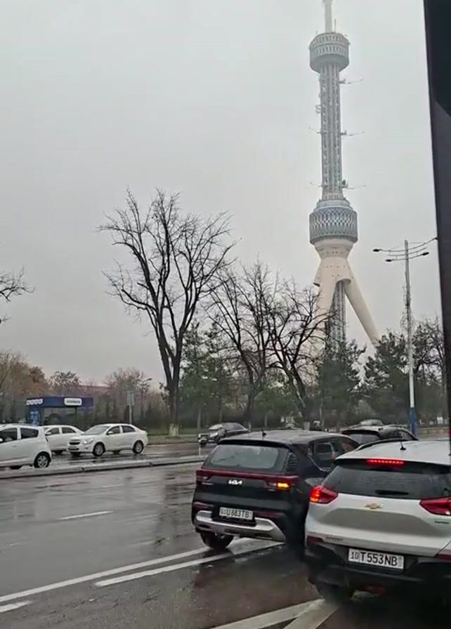 view of the Tashkent TV Tower on a rainy day. The tower is tall and slender, with a wide base and a needle-like top. There are trees in front of the tower, and cars are driving on the wet street. The sky is overcast, and the light is dim. The video is taken from a slightly elevated position, possibly from a building or other structure. Cars with license plates from Uzbekistan can be seen in traffic.