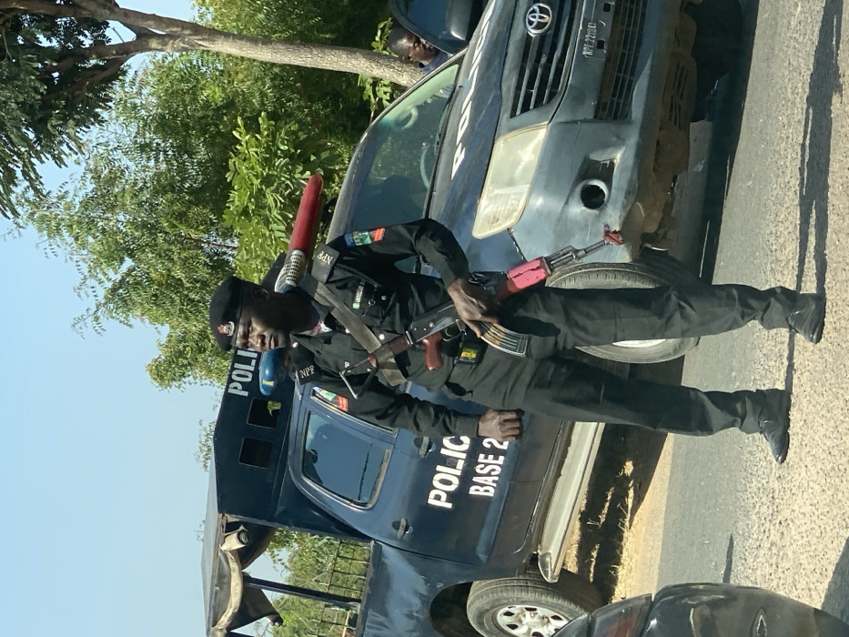 A Nigerian Police Force (NPF) officer stands on a paved road in Unguwar Sarki, Nigeria, during daylight hours under a clear sky