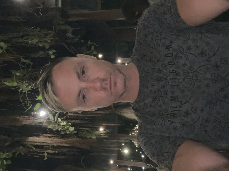 A male individual is centered in a medium shot, looking directly at the camera with a neutral expression. He has short, styled hair with lighter blonde highlights and light-colored eyes. He is wearing a dark grey t-shirt featuring a subtle dark floral or leaf pattern, with the words "PALM LAGOON" printed across the chest. The background is dimly lit, indicating nighttime or evening, and features abundant hanging vegetation resembling vines and aerial roots, interspersed with numerous warm string lights and individual bare bulbs. Dark structural elements, likely made of wood, are partially visible. Blurred outlines of other individuals are discernible in the background to the left and right, suggesting a public setting. The scene takes place in an open-air or semi-enclosed establishment in the city of Ubud, Indonesia, characterized by its tropical decor and atmospheric lighting.