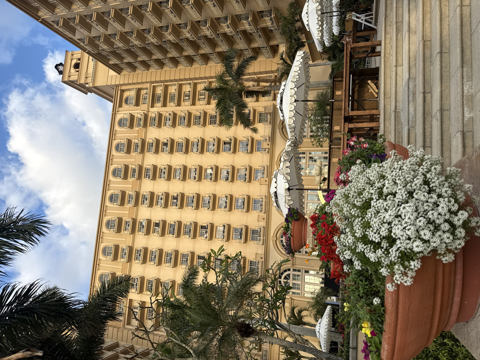 The image displays an exterior view of a multi-story, light-tan architectural complex, identified as a resort or hotel, located in Pelican Bay, USA, under a partly cloudy blue sky. The primary building facade features numerous rows of windows, each equipped with a small wrought-iron balcony. The uppermost floor exhibits arched window openings, also with matching balconies. To the right, a taller building section culminates in a tower flying a black flag with a skull and crossbones (Jolly Roger). Adjacent to this, another building wing with repeating balconies is visible. In the foreground, large terracotta-colored planters are filled with white, red, purple, and yellow flowering plants; white sweet alyssum cascades over the edges of a prominent planter. Wide stone steps descend towards an outdoor patio area. This area is furnished with multiple white, two-tiered umbrellas with scalloped edges, alongside wooden tables and chairs. A white, multi-tiered fountain is partially visible near the base of the building, between the umbrellas. Several tall palm trees and other tropical foliage are interspersed throughout the scene. No individuals are present. The scene is illuminated by natural light, consistent with either morning or late afternoon conditions.