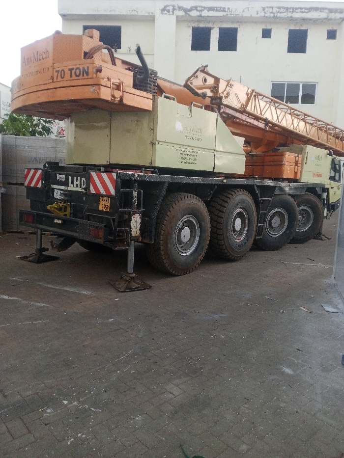 A large orange and beige crane truck is parked on a paved surface. The crane, labeled "AnyMech Engineering Ltd. 70 TON," has a lattice boom extending outwards. The truck features four large wheels on each side and deployed outriggers for stability. "LHD" is printed on the rear. A multi-story building with dark windows is in the background.