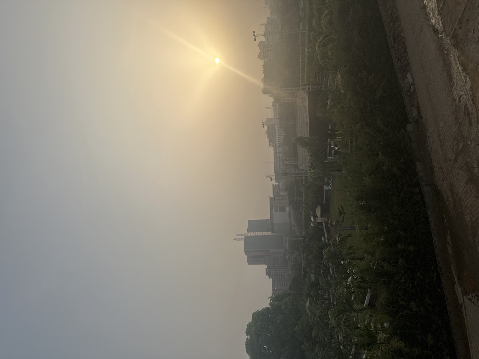 An urban landscape under a hazy, bright sun. Buildings of varying heights are visible, partially obscured by a thick haze or fog, with construction cranes dotting the skyline. Lush greenery, possibly trees or a park, is seen in the foreground, softening the city's hard edges. A textured surface, like a wall or balcony, occupies the right edge of the frame, offering a closer vantage point. The overall atmosphere is muted and hazy, with the sun acting as a dominant light source.