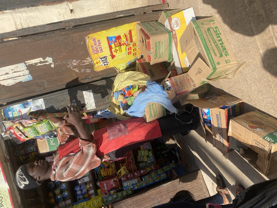 A dark-skinned male adult, wearing a black and white patterned knit cap, a reddish-brown plaid long-sleeved shirt, and a red apron, stands in the doorway of a retail shop in Jos, Nigeria