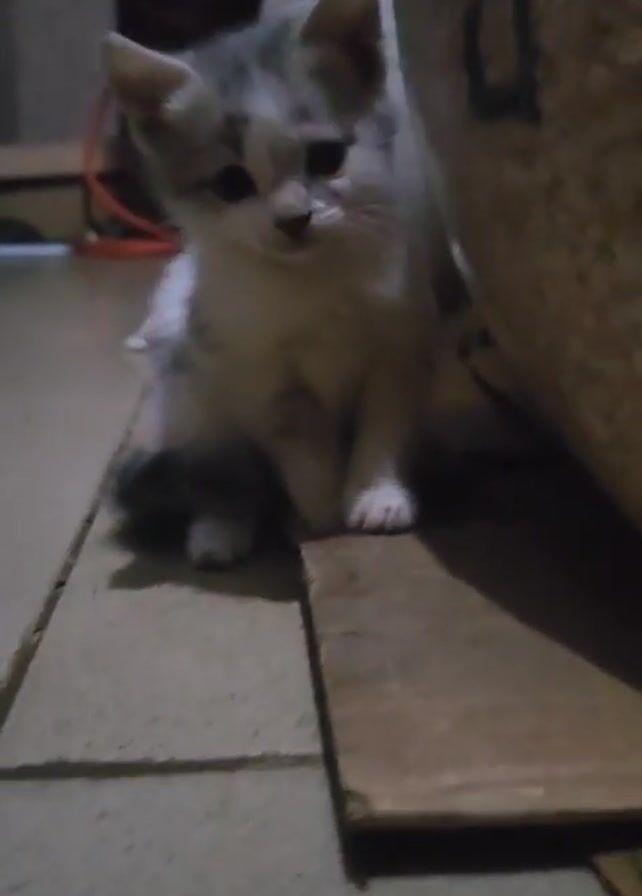 A small kitten sits on a tiled floor next to a wooden plank, its white and gray fur contrasting against the dim lighting. The kitten faces forward, appearing inquisitive, with the backdrop featuring blurred household items and a large cylindrical object.