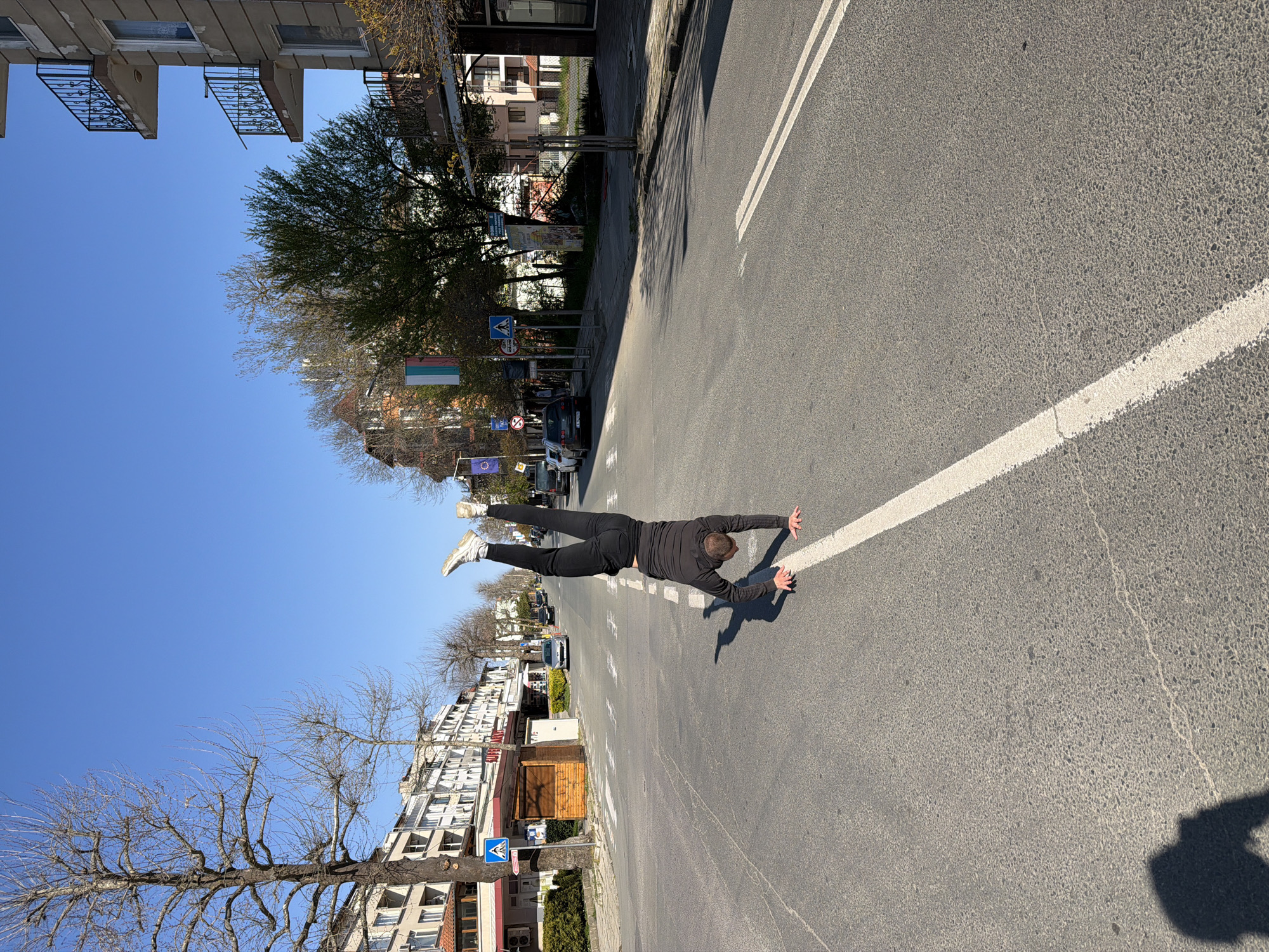 A man in dark clothing and white shoes is lying prone on an asphalt road with his arms outstretched, seemingly performing a handstand, with his legs extended upwards towards the blue sky. The road is marked with a thick white line running lengthwise. Buildings and trees line either side of the road, with various street signs visible in the background. The location is a street in Primorsko, Bulgaria, during daylight hours.