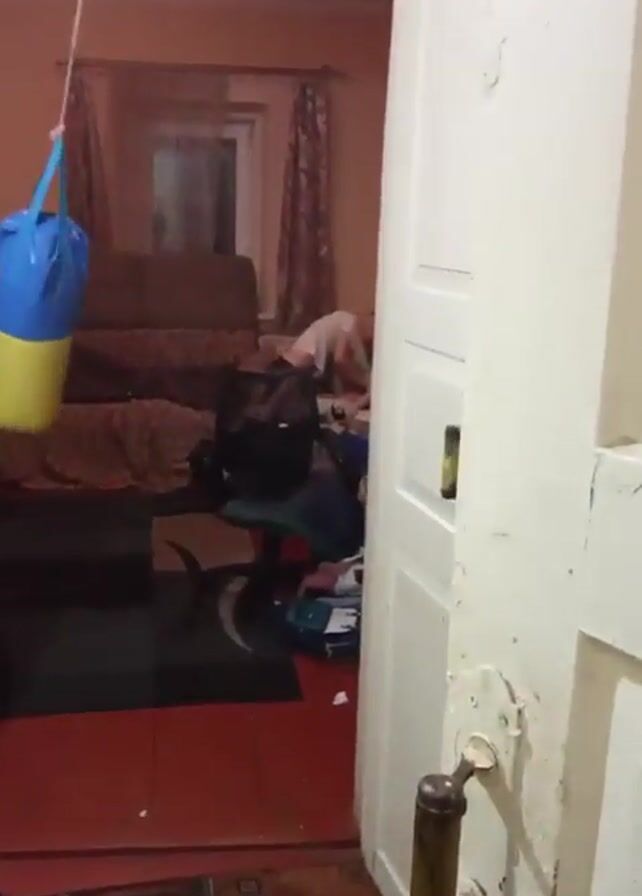 room with a punching bag hanging from the ceiling. The punching bag is blue and yellow, the colors of the Ukrainian flag. A person is lying on the bed in the background. The room appears to be messy, with clothes and other items scattered on the floor. The camera is being held by someone standing in the doorway.