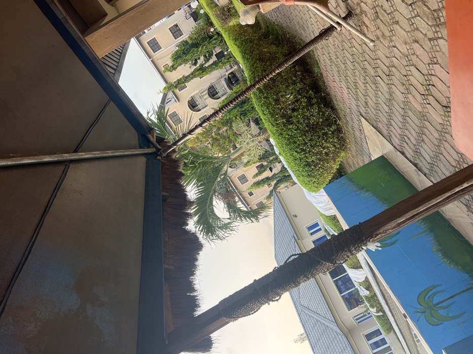 view looking up through a thatched roof structure. A palm tree and other lush greenery are visible outside. Buildings are seen in the background, some with white walls and blue windows. A paved area and a blue surface with a palm tree design are also visible. A support beam wrapped in rope runs diagonally across the scene.