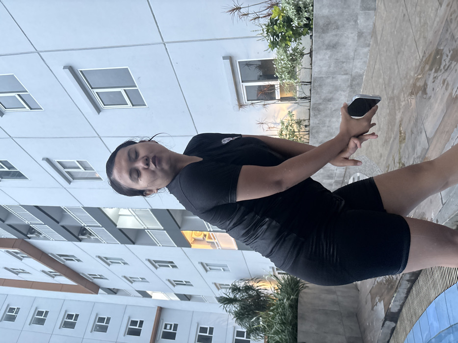 The image depicts a female individual posing outdoors next to a swimming pool, within a modern residential or hotel complex in Sidoarjo, Indonesia