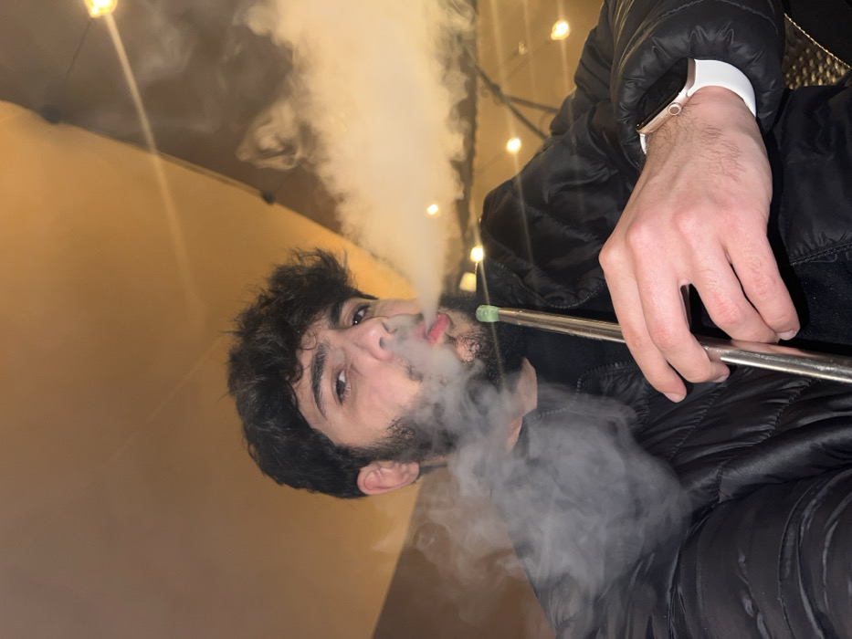 A person with dark hair and a beard exhales a large plume of white smoke. They are holding a metal pipe, presumably for smoking. They wear a dark, quilted jacket and a white wristwatch. The background is a blurry mix of beige walls and a string of warm, glowing lights. The image is shot at a slightly tilted angle.