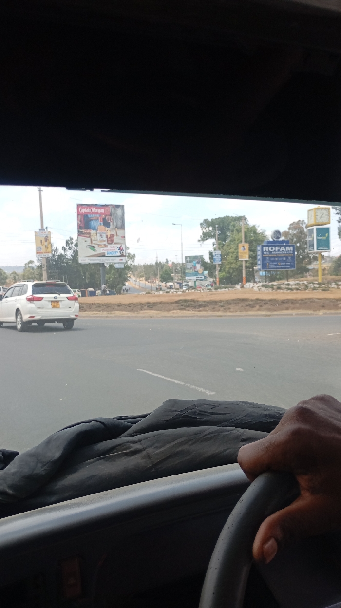 A driver's perspective from inside a vehicle looking out onto a road. A white car is on the road, passing in front of billboards advertising "Captain Morgan" and "ROFAM". The driver's hand rests on a grey steering wheel. A dark cloth-like material is draped over the dashboard. The sky is slightly overcast, with trees and buildings lining the horizon.