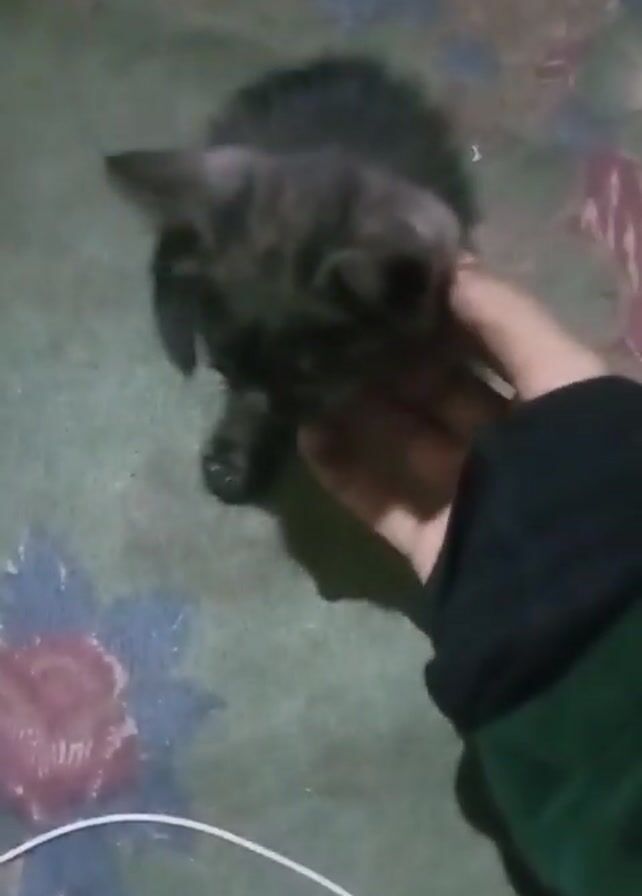 - "A person in a dark green and black long-sleeved shirt is holding a small gray kitten by the scruff of its neck" by FM-5uZyG3, licensed under CC BY 4.0