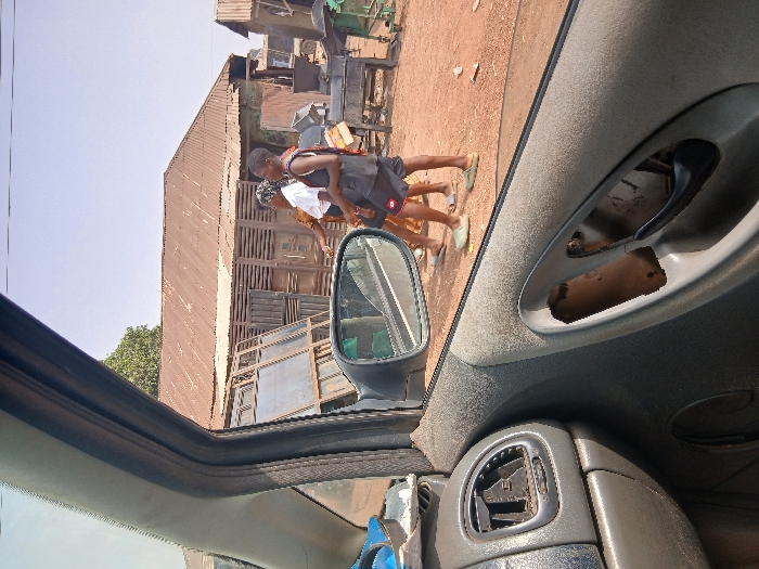 The image depicts an outdoor scene in Karshi, Nigeria, viewed from the passenger compartment of a vehicle