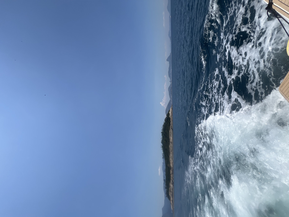 The image depicts a maritime scene observed from the stern of a moving vessel, likely in an unknown city within Brazil, specifically suggested to be Rio de Janeiro due to a distant landform resembling Sugarloaf Mountain on the horizon. The upper half of the frame consists of a clear, bright blue sky containing a few minute dark specks. The lower half presents deep blue ocean water, prominently featuring a wide, frothy white wake generated by the boat, extending from the lower left diagonally towards the mid-right. On the left horizon, a verdant island or peninsula with a distinct rocky shoreline and dense green vegetation is visible. Further along the horizon to the right, a series of additional, more distant landmasses are present, partially obscured by atmospheric haze. A small section of the boat's deck is visible in the bottom right, characterized by light brown planking texture, a partially visible yellow object (possibly a buoy or fender), and dark mooring ropes. No human subjects are visible in the frame.