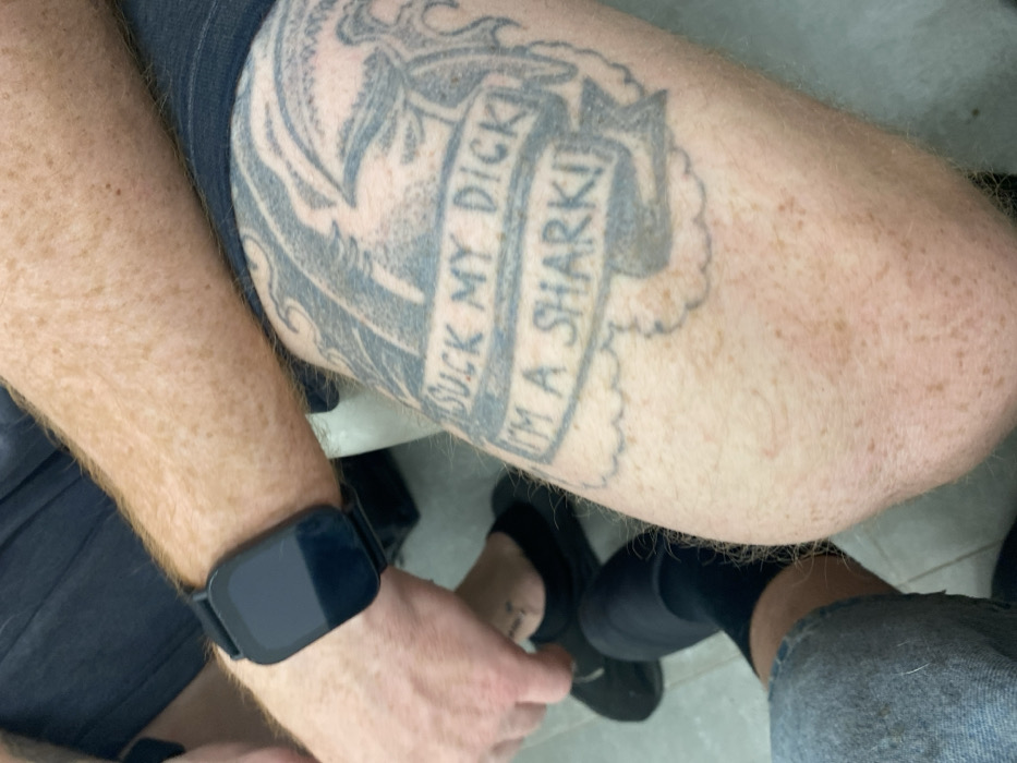 A close-up, high-angle shot depicts multiple body parts belonging to at least two, possibly three, individuals in an indoor setting. The primary subject is the upper left leg (thigh) of an individual, characterized by light skin tone and numerous freckles. A prominent, faded black and grey tattoo covers a significant portion of the thigh. The tattoo design features a banner in the center proclaiming "SUCK MY DICK! I'M A SHARK!" in capital letters. Above and around this banner, abstract or stylized elements, possibly representing a shark or other marine imagery, are discernible, with a scalloped line bordering the lower edge of the tattoo composition. The individual with the tattooed leg is wearing dark fabric shorts, visible at the top edge of the thigh. Overlapping the upper part of the tattooed leg, a forearm and hand, also with light skin and freckles, are visible. This individual wears a black smartwatch with a dark, unlit screen on the left wrist. A small, indistinct tattoo is visible on the inner wrist. This arm appears to belong to a different person. To the lower left, partially visible, is the lower leg and foot of another individual, or possibly a third person. This person is wearing a black sock and what appears to be a dark-colored shoe or slipper, along with light-colored, possibly blue denim, material (shorts or pants). The background consists of light-colored, possibly tiled, flooring and an indistinct white or light-colored object, possibly a furniture arm or medical equipment, in the upper right. No specific identifying features of a city or country are visible.