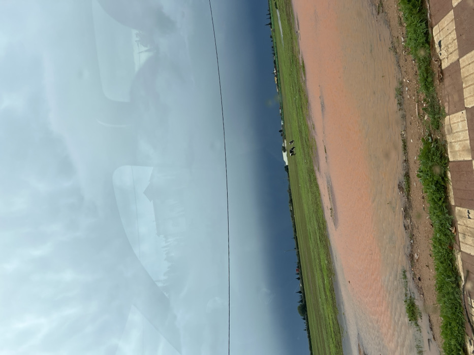 The scene, located in Ain Johra, Morocco, depicts a broad outdoor landscape under a heavily overcast sky, characterized by thick, dark grey storm clouds in the distance and lighter, wavy clouds higher up. The image is captured from inside a vehicle, with reflections of its interior structure and external elements, such as buildings and trees, visible on the glass surface. In the immediate foreground, a checkered curb or sidewalk, featuring brown and off-white squares, extends horizontally along the bottom edge. Beyond this, a narrow strip of green grass and earth transitions into large, irregular puddles of reddish-brown, muddy water. These muddy water bodies occupy a significant portion of the lower half of the image and partially submerge a vast, flat green field that stretches into the middle ground. In the middle distance on the green field, two bovines are visible; one is predominantly black and white, and the other appears darker, both standing or grazing. A single dark, thin utility wire or cable runs horizontally across the image at approximately mid-height. The background features a faint line of trees or sparse vegetation along the horizon, with indistinct outlines of distant buildings or structures visible beneath the dark cloud cover.
