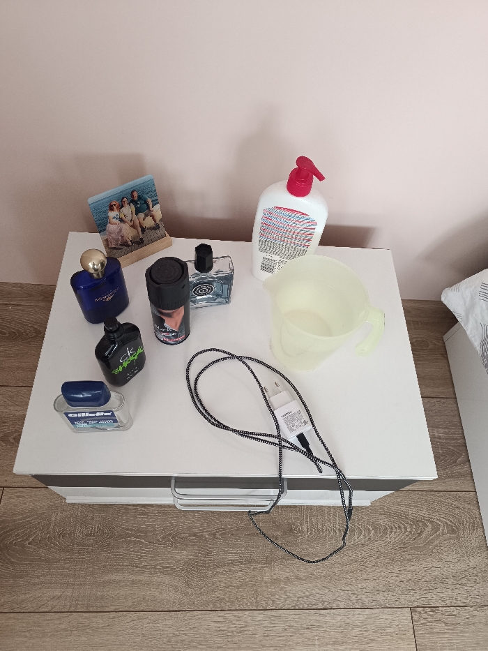 - "An overhead view reveals a collection of personal items situated on a white two-drawer bedside table with metallic handles, placed against a pale pink wall in Cherkovitsa, Bulgaria" by FM-SVEiv2, licensed under CC BY 4.0