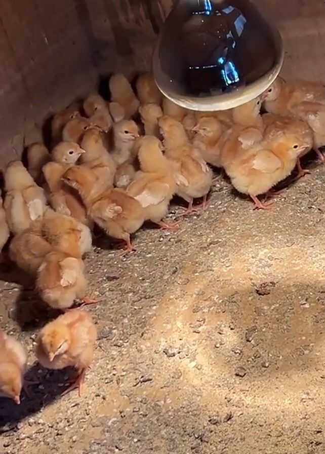 A low-angle, steady shot depicts a group of light brown chicks clustered together under a heat lamp in what appears to be a wooden enclosure