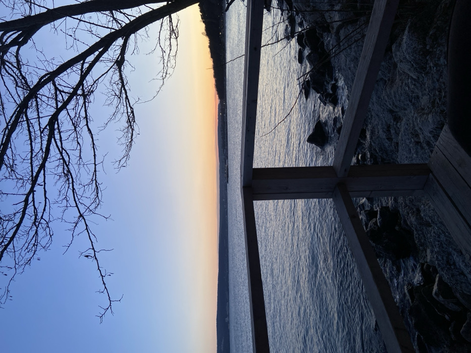 The image displays a twilight scene overlooking a body of water, likely the Black Sea or Varna Lake, from an elevated position in Varna, Bulgaria. The sky transitions from a deep blue overhead to lighter blue, yellow, and orange hues at the horizon, indicating sunset or dusk. A vast expanse of dark blue-grey water occupies the middle ground, showing gentle ripples. Across the water, a low, dark landmass or distant coastline is silhouetted against the horizon, with faint artificial lights discernible. In the upper right quadrant, the bare, dark branches of a deciduous tree are silhouetted against the sky. The foreground features a light-colored wooden railing structure, comprising a vertical corner post and two horizontal planks, framing the lower portion of the view. Immediately below the railing, a rocky shoreline is visible, with dark, irregular rocks partially submerged by the water. Some lighter-colored material, possibly ice or sea foam, is present among the rocks at the water's edge. No individuals or specific activities are present in the depicted scene.
