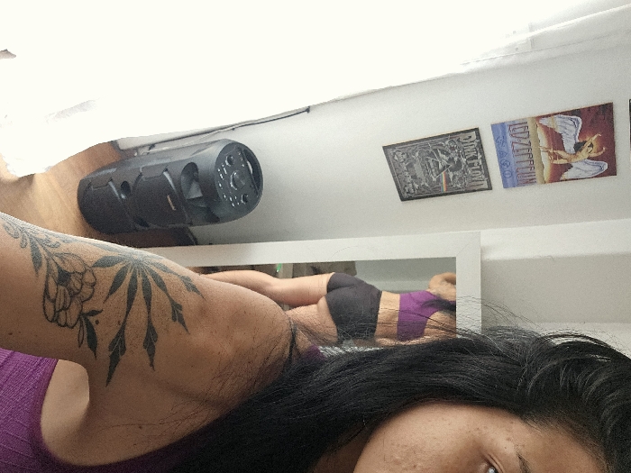 The image depicts an indoor residential scene set in Buenos Aires, Argentina. A female individual is partially visible on the right side of the frame, showing her right eye, cheek, and dark hair. Freckles are discernible on her cheek. She is wearing a purple athletic top, and her right upper arm displays a tattoo featuring a stylized botanical design with radiating elements and a prominent flower. A white-framed rectangular mirror occupies the central-right portion of the image. The mirror reflects the individual from the back, showing her wearing a purple sports bra and black shorts. Her glutes and lower back are clearly visible in the reflection. On the white wall to the left of the mirror, two framed posters are vertically mounted. The upper poster features "Led Zeppelin" text alongside an image of a winged figure and the word "SAGO." Below it, a "Pink Floyd" poster displays imagery reminiscent of "The Dark Side of the Moon" album. Below the posters, resting on a light-colored wooden floor, is a black, rectangular, multi-speaker audio unit. A bright, diffused light source, consistent with a window covered by a sheer white curtain, is present on the far left, illuminating the scene. The individual appears to be taking a self-portrait within this personal space.