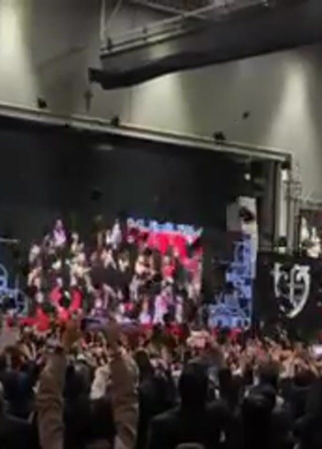 A large crowd is gathered inside what appears to be a convention hall or auditorium