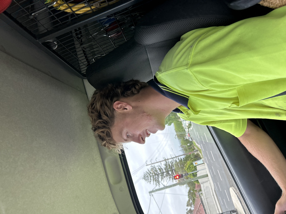 Inside a vehicle, a fair-skinned young man with short, curly blonde hair, wearing a bright yellow work shirt with dark blue trim, looks toward the window. The outside view reveals a street with trees and a red traffic light. The vehicle's interior includes a wire rack overhead and a gray seat. The photo is taken at an angle.