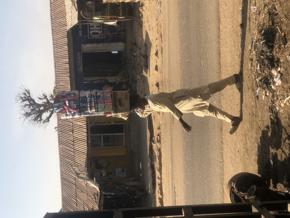 A daytime street scene in Kufena, Nigeria, features a young male subject walking from right to left on a dirt path adjacent to a paved road