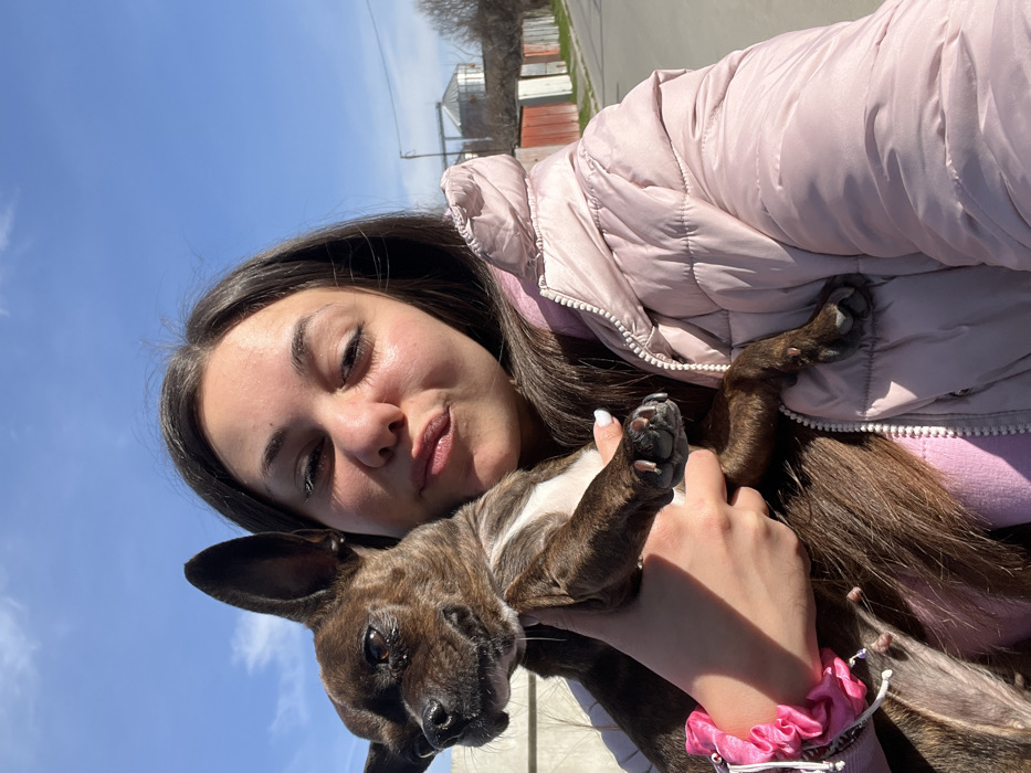 - "A female subject, with long dark hair, wearing a light pink puffer jacket over a lighter pink top, holds a small dark brindle dog with white chest markings in her arms" by FM-lak1E3, licensed under CC BY 4.0