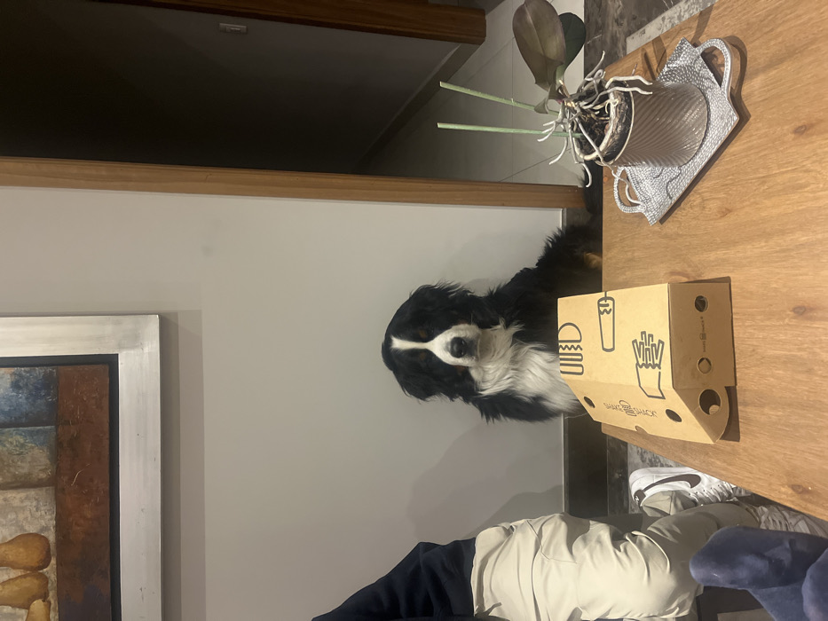 - "A Bernese Mountain Dog peeks from behind a wall next to a Shake Shack food container on a wooden table" by FM-SikrH3, licensed under CC BY 4.0
