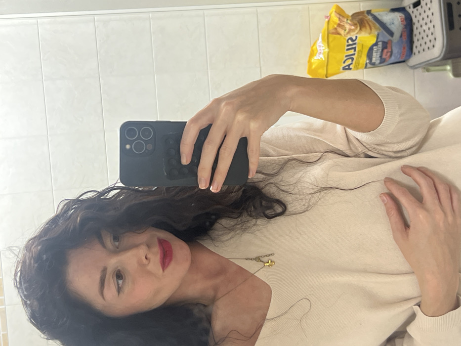 A woman with long, dark, curly hair, fair complexion, red lipstick, and eyeliner is captured in a mirror selfie