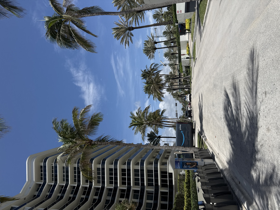 The image displays a sunlit street scene in Surfside, United States, characterized by a prominent high-rise building and numerous palm trees