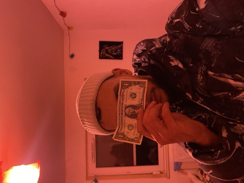 A person in a light-colored beanie and dark marbled jacket holds a one-dollar bill over their face. The room is lit with a strong red light. Behind the person is a window with blinds and a black square decoration is seen hanging on the wall. Multicolored lights dangle from the ceiling.