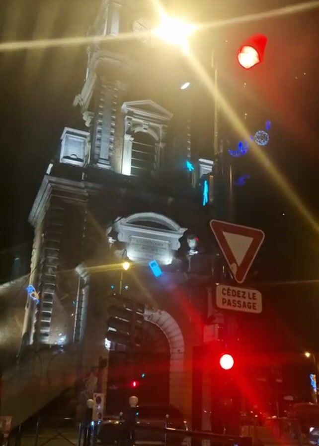 The video depicts a low-angle shot of a brick clock tower at night. The tower is illuminated by bright lights, which also cause significant lens flare. A traffic signal displays a red light, and a triangular 'Cédez Le Passage' (Yield) sign is visible. Blue holiday lights are strung nearby. There are metal barriers along the side of the road. The overall scene is urban and dimly lit, with a somewhat misty or foggy atmosphere.