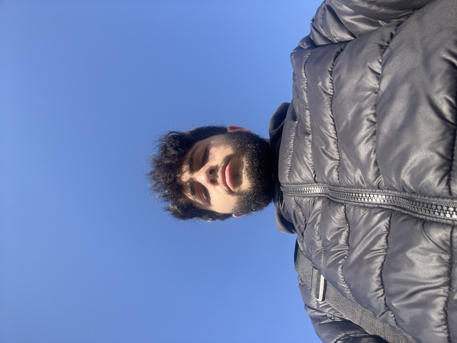 A low-angle close-up photograph captures a male individual from the chest up, positioned against a clear, vibrant blue sky. The individual has dark, curly hair and a full dark beard, and his eyes appear partially closed while looking directly towards the camera. He is wearing a dark, likely black, puffer jacket with horizontal quilting and a visible central zipper. A black strap, consistent with that of a shoulder bag, is visible over his left shoulder. The environment is an open outdoor space under bright daylight conditions in Jaber as-Sirhan, Jordan, with no other structures or subjects visible.