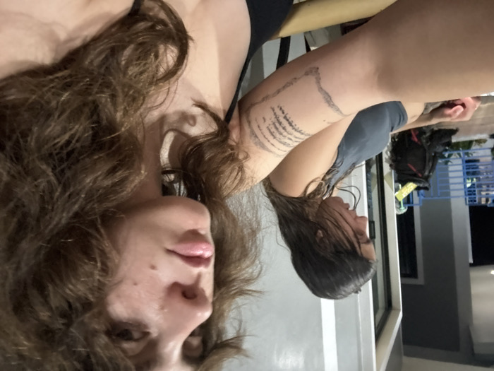 This image depicts two females in an outdoor or semi-outdoor setting, likely a balcony or patio, in Baan Hin Kong, Thailand