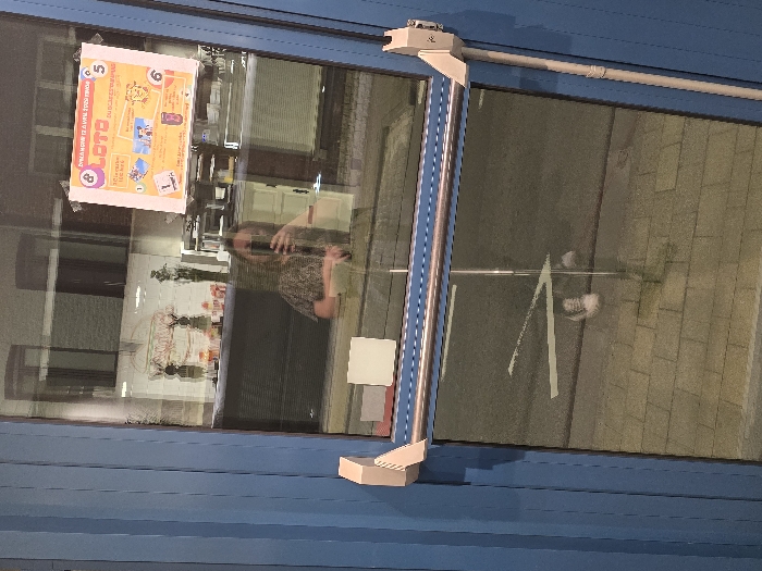 The image displays a reflection in a blue-framed glass entrance door of a commercial establishment located in Mouscron, Belgium