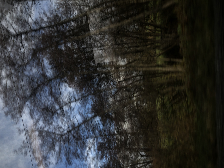 The image displays a blurred exterior scene, depicting a rural or semi-rural landscape, specifically located in Steinbourg, France, viewed from a moving perspective. The scene is dominated by a dense arrangement of deciduous trees, mostly appearing bare of leaves, suggesting a late autumn or winter season. **Subjects and Objects:** * **Trees:** Numerous tall, slender trees with dark, visible trunks and intricate networks of bare branches occupy the majority of the frame, extending from the mid-ground to the top. The individual forms of the trees are elongated and smeared horizontally due to motion blur. * **Sky:** Patches of a clear blue sky, interspersed with wispy white and light grey clouds, are visible through and above the tree canopy, particularly in the upper left quadrant. * **Ground Cover:** A band of green vegetation or grass is visible at the base of the trees in the lower-middle portion of the image. This ground cover also exhibits significant horizontal motion blur. * **Foreground:** The very bottom edge of the image presents a dark, indistinct, heavily blurred area, likely representing the immediate foreground such as the ground or part of the viewing platform. * **Artifacts:** A faint, light-colored rectangular vertical streak is present on the right side of the image, potentially a reflection or glare artifact on the viewing surface (e.g., a window). Thin, dark, horizontal linear elements, possibly overhead wires, are faintly discernible against the sky in the upper left. **Actions and Interactions:** The pronounced horizontal motion blur across all elements indicates that the photograph was captured while the camera or the observer was in motion, likely traveling past the stationary landscape. There are no visible people or animals, nor any explicit interactions depicted within the frame. **Environment:** The environment is characterized by natural elements, primarily trees and sky, with some ground vegetation. The composition and blurring suggest a view from a vehicle traversing a wooded area or an adjacent open field.