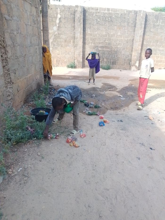 An outdoor scene in an unpaved, dusty alleyway or open area within Katsina, Nigeria, near Muhammadu Dikko Stadium, features four young individuals. In the immediate foreground, a boy wearing a dark hooded jacket and light-colored trousers kneels, holding a green plastic bottle, as he handles or arranges numerous small, colorful items individually wrapped in clear plastic, spread in an arc on the sandy ground. A black plastic basin rests beside him near a patch of green vegetation. To the left, partially concealed by a light-colored concrete block wall, a girl wearing a yellow head covering and dress observes the activity. In the mid-background, another girl, clad in a purple head covering and a light dress, stands with a flat, round tray balanced on her head. To the right, a boy in a light-colored shirt with a dark emblem and red trousers stands, looking towards the viewer with a slight smile. The environment consists of rough, dry, and slightly muddy ground, flanked by concrete block walls of varying heights under bright daylight.