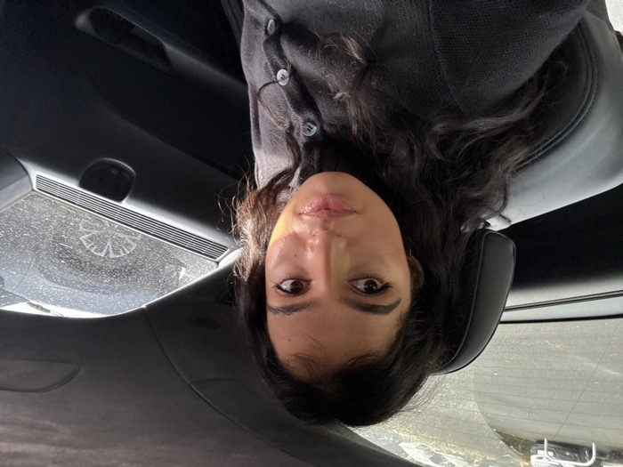 A female individual with dark, wavy hair and dark eyes is seated in the rear passenger compartment of a vehicle, looking directly towards the camera